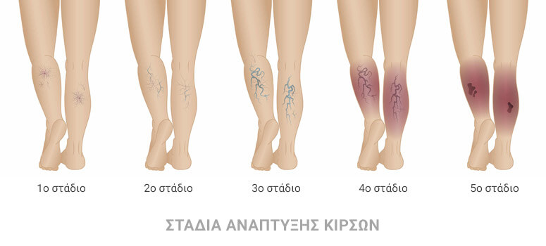 Κιρσοί: Οι κιρσοί σχηματίζονται στις επιφανειακές φλέβες καθώς το αίμα που λιμνάζει σε αυτές τις διογκώνει δίνοντάς τους σχοινοειδή μορφή με πιθανές ελικώσεις. Εκτός του αισθητικού προβλήματος οι κιρσοί προξενούν κούραση, κάψιμο, φαγούρα, κράμπες και πόνο. Οι ενοχλήσεις επιδεινώνονται συνήθως μετά από μακρά καθιστική θέση, τις βραδινές ώρες, στην αρχή κάθε ζεστής εποχής, προ της περιόδου και κατά την εγκυμοσύνη.