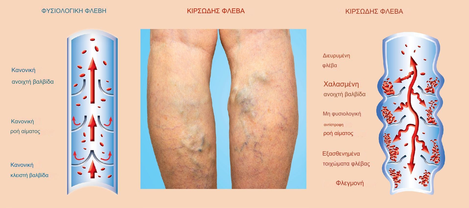 Οι φλέβες είναι τα αγγεία που επιστρέφουν το αίμα στην καρδιά. Ειδικά για τις φλέβες των κάτω άκρων αυτό σημαίνει ότι πρέπει να δουλεύουν ενάντια και στη βαρύτητα. Για να το επιτύχουν αυτό αφενός χρειάζονται τη βοήθεια των μυών, οι οποίοι με την κίνηση τους πιέζουν τις φλέβες και σαν αντλία ωθούν το αίμα προς τα πάνω και αφετέρου έχουν κατά μήκος τους βαλβίδες, οι οποίες μόλις περάσει το αίμα, φυσιολογικά κλείνουν και δεν επιτρέπουν να γυρίσει προς τα κάτω, ωθώντας το έτσι σταδιακά μέχρι την καρδιά. Όταν όμως αυτές οι βαλβίδες χαλάσουν, το αίμα επιστρέφει προς τα κάτω, λιμνάζει στα πόδια, η πίεση στο εσωτερικό των φλεβών αυξάνεται κι έτσι φουσκώνουν.